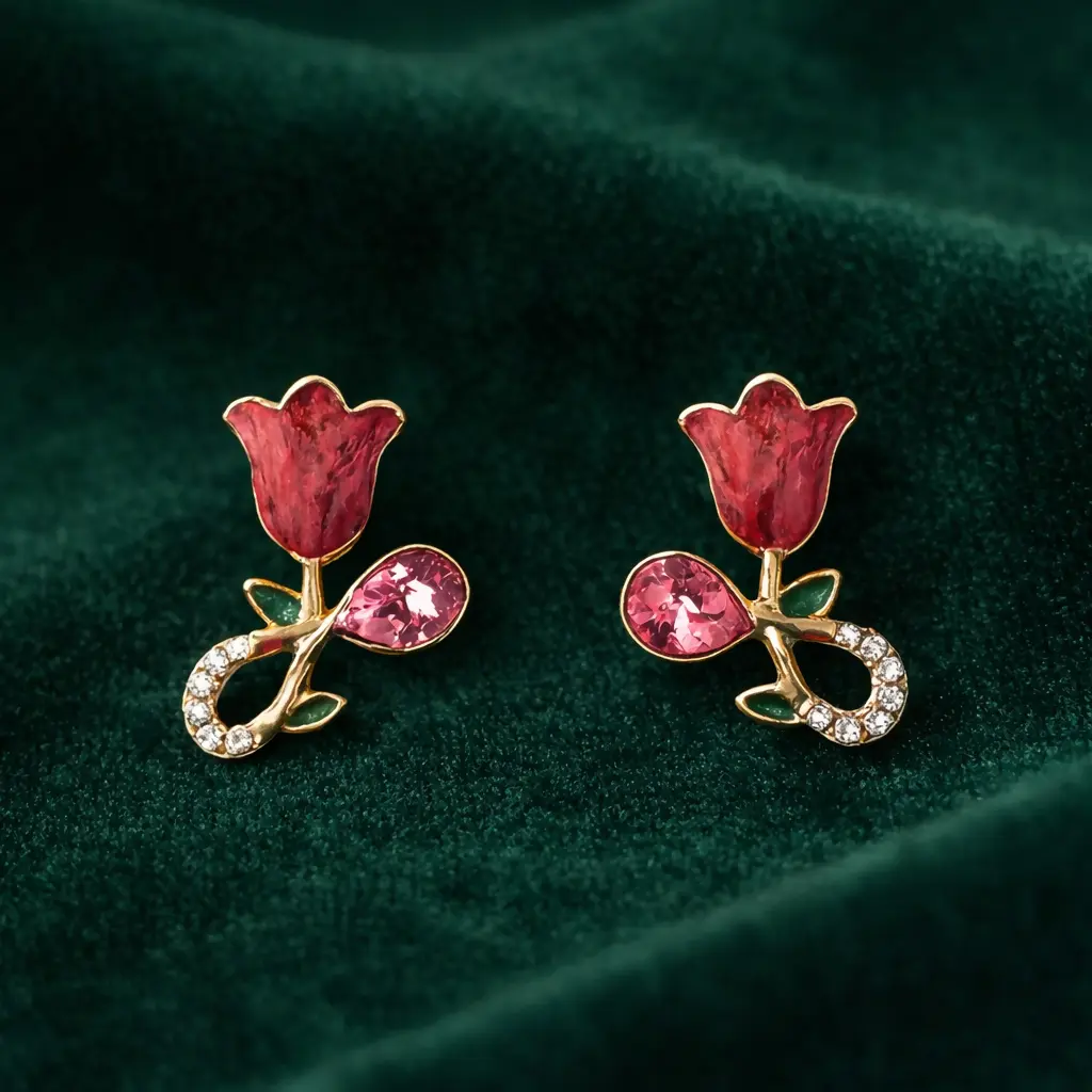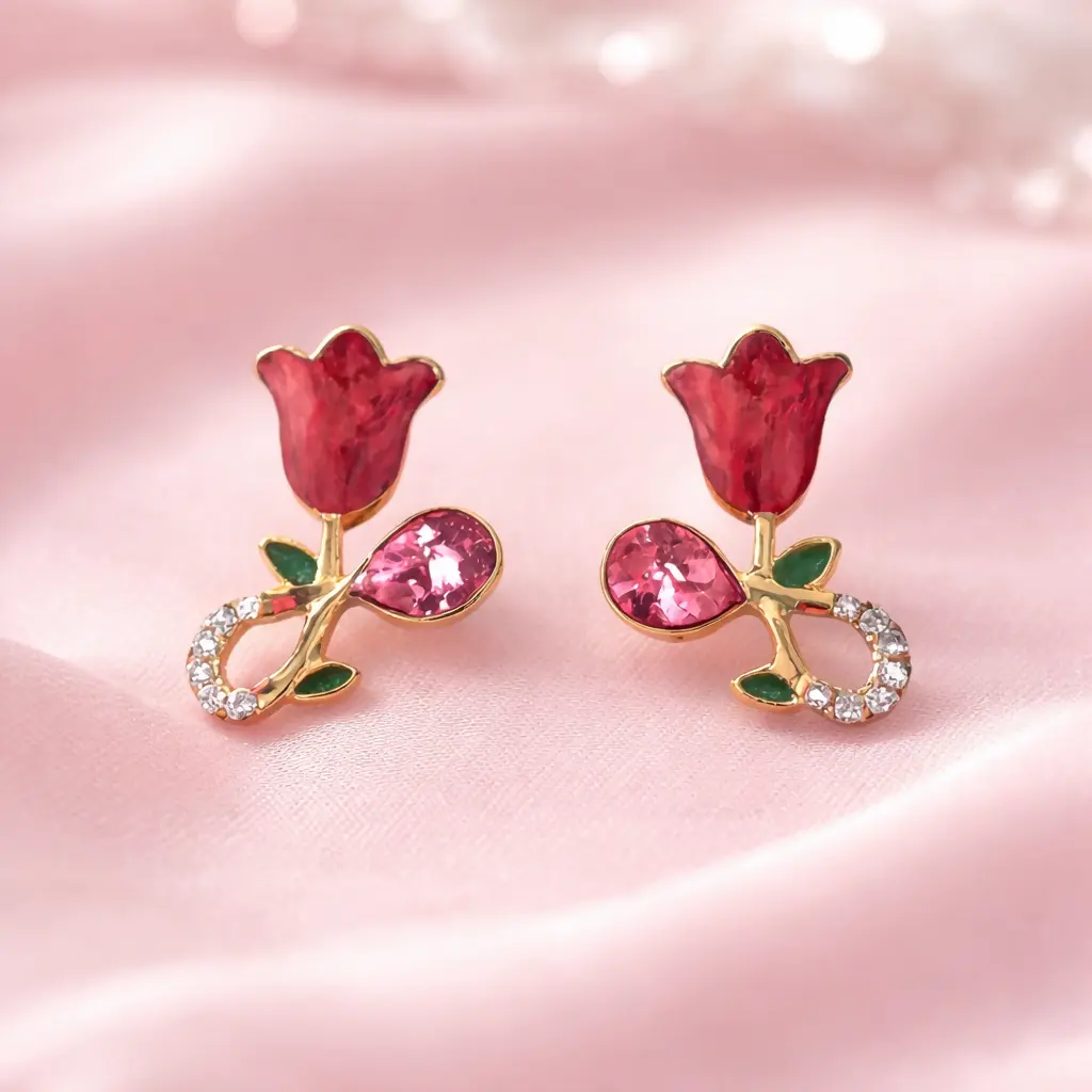 Rose floral earrings, crystal stud earrings, gold plated earrings, designer earrings, floral stud earrings, party wear earrings, elegant earrings for women, trendy earrings india, lightweight earrings, gift earrings for women