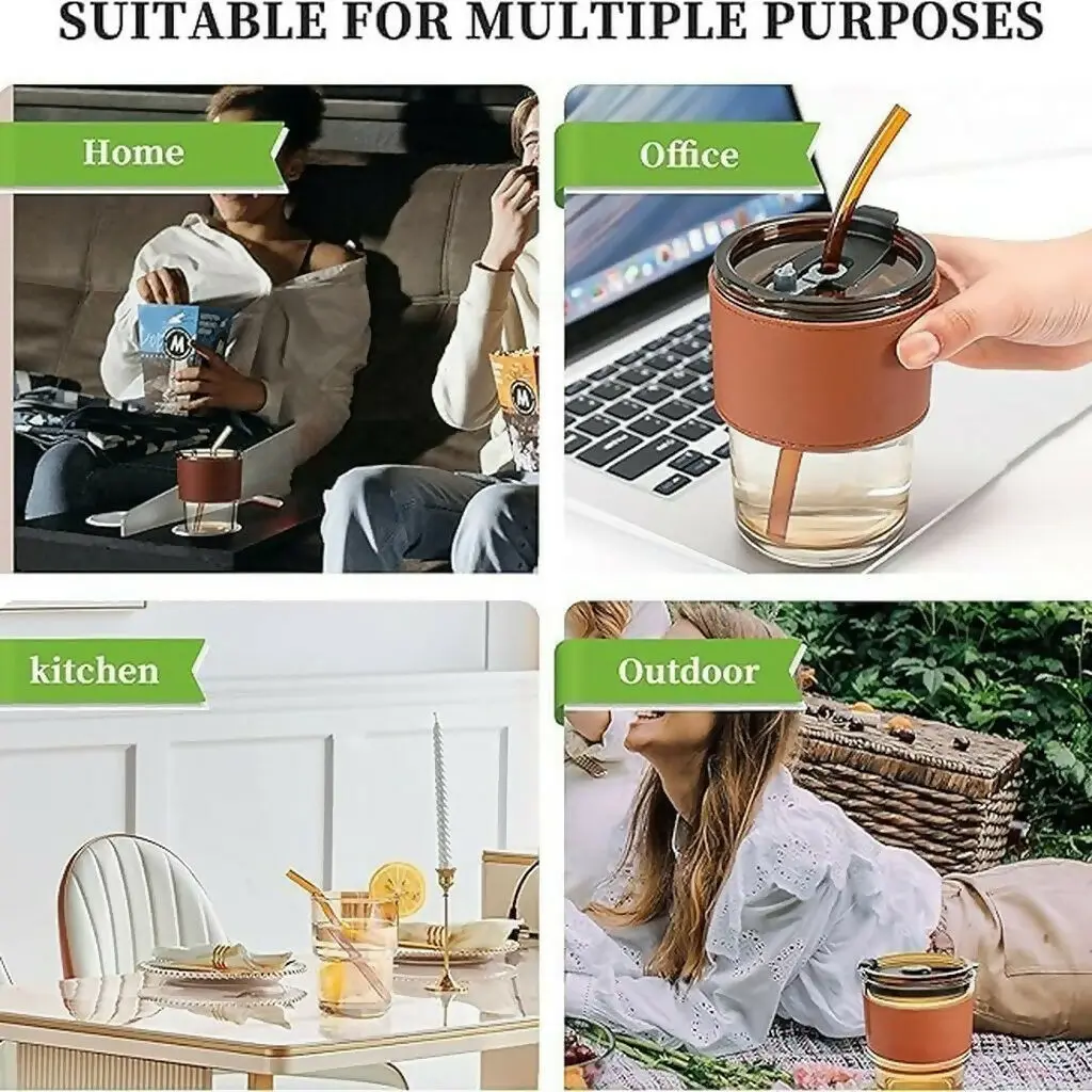 glass tumbler with straw, coffee cup with lid, reusable glass cup, juice tumbler, portable drinking cup, glass coffee mug, travel tumbler, straw glass cup, aesthetic glass tumbler, office drink cup, leather sleeve cup, modern glass mug