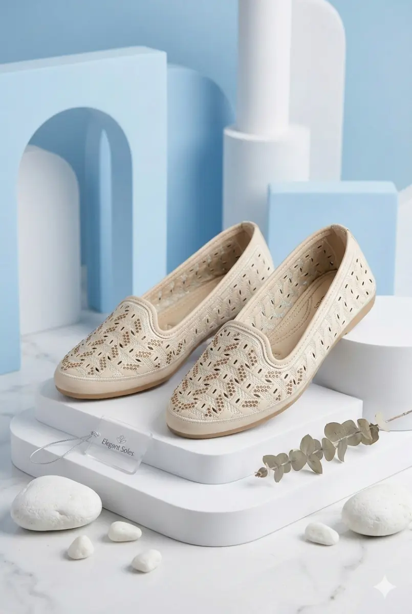 Women ethnic footwear, stylish bellies for ladies, laser cut juttis, comfortable flats for women, beige ballerinas, wedding wear shoes for women, Elegant Soles brand shoes.