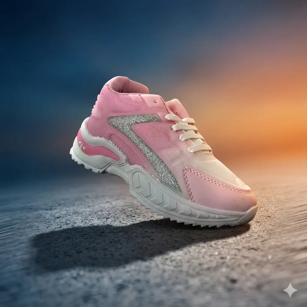 Upgrade your child’s footwear collection with these premium imported kids glitter sneakers designed for comfort, durability and modern fashion appeal. Featuring a beautiful soft pink base with sparkling silver glitter accents, these trendy kids sports shoes are perfect for school, outdoor activities, birthday parties and casual outings.